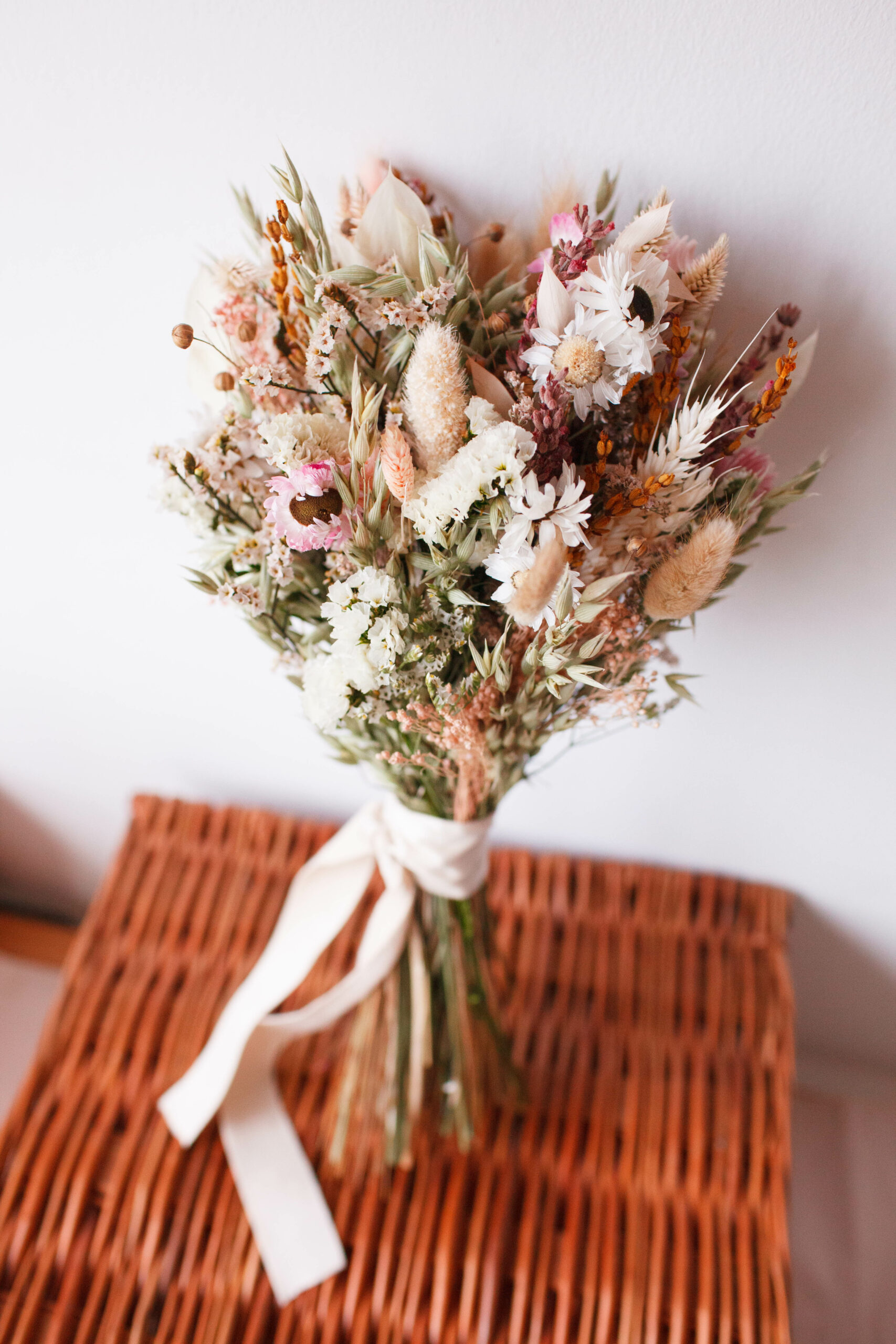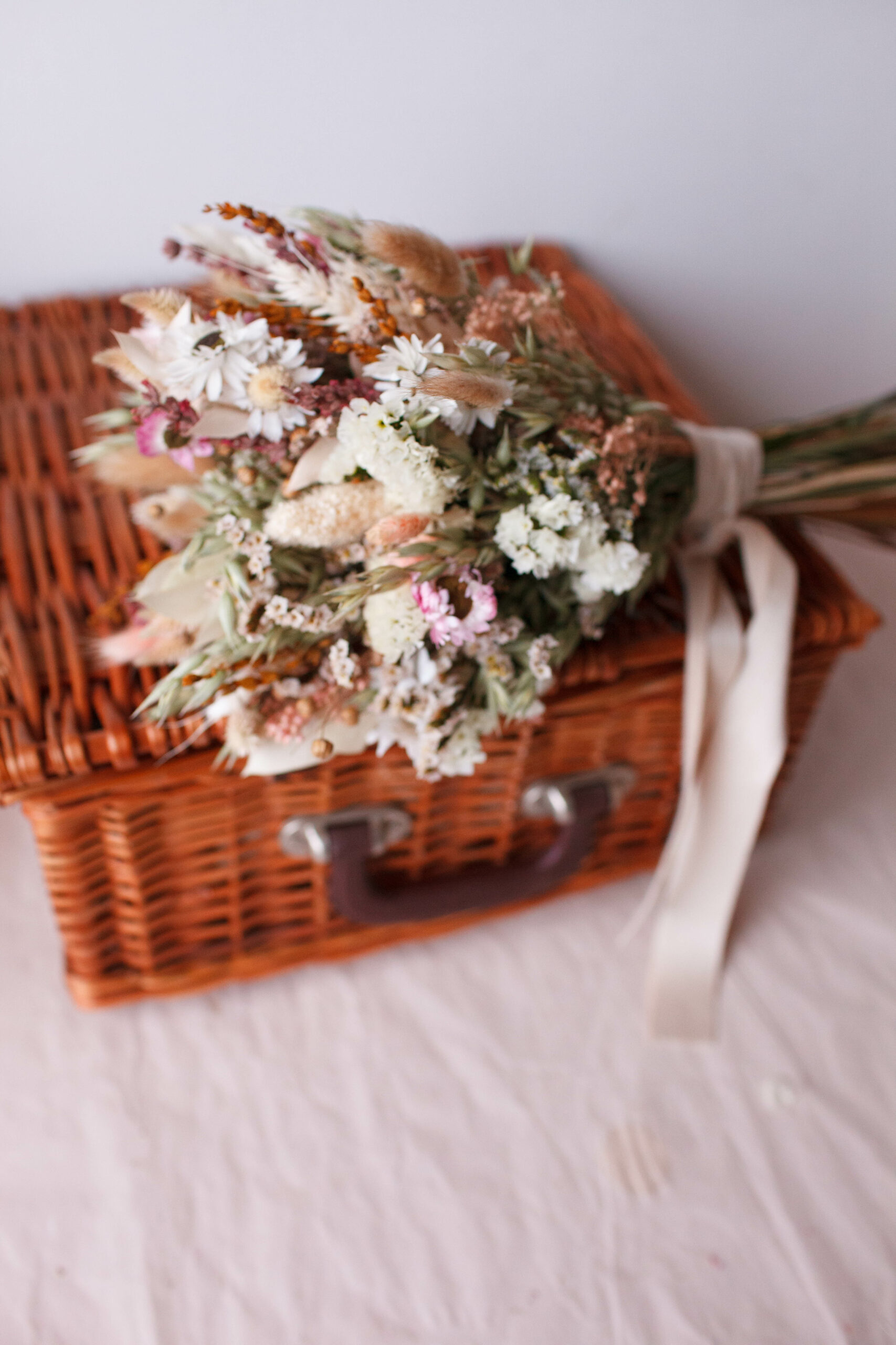 Este ramo de novia se elabora a mano seleccionando cuidadosamente flores preservadas y secas de la mejor calidad. Al ser un diseño duradero, no requiere mantenimiento y conservará su belleza intacta durante años, permitiéndote guardar un pedazo de tu historia nupcial como un objeto decorativo eterno en tu hogar.