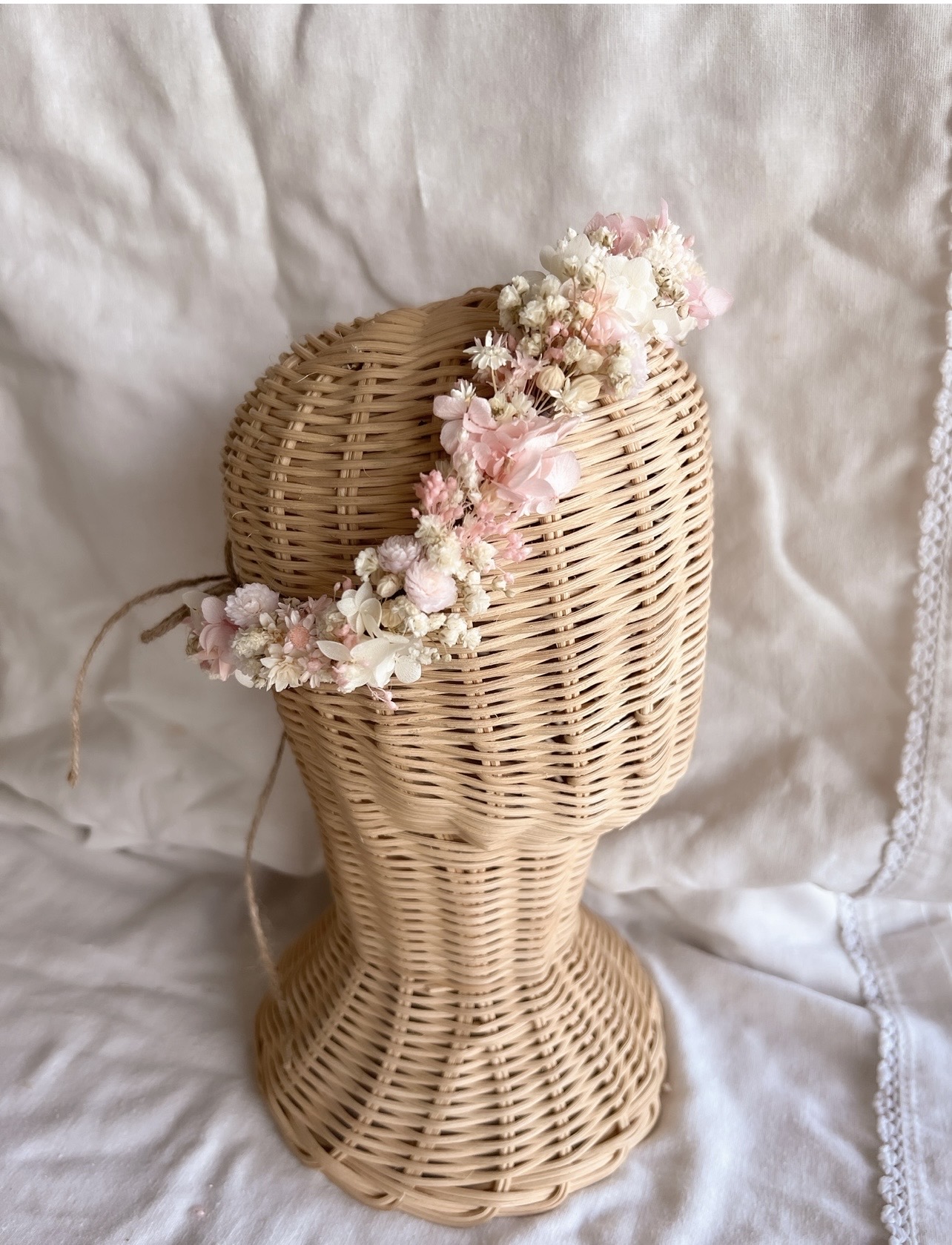 Está elaborada con una cuidada selección de flores preservadas como glixia, hortensia, siempreviva, paniculata y broom, que aportan textura, volumen y un aspecto muy natural. La combinación de pequeñas flores y pétalos delicados crea un efecto ligero y armonioso, ideal para niñas que buscan un complemento floral especial y cómodo de llevar.