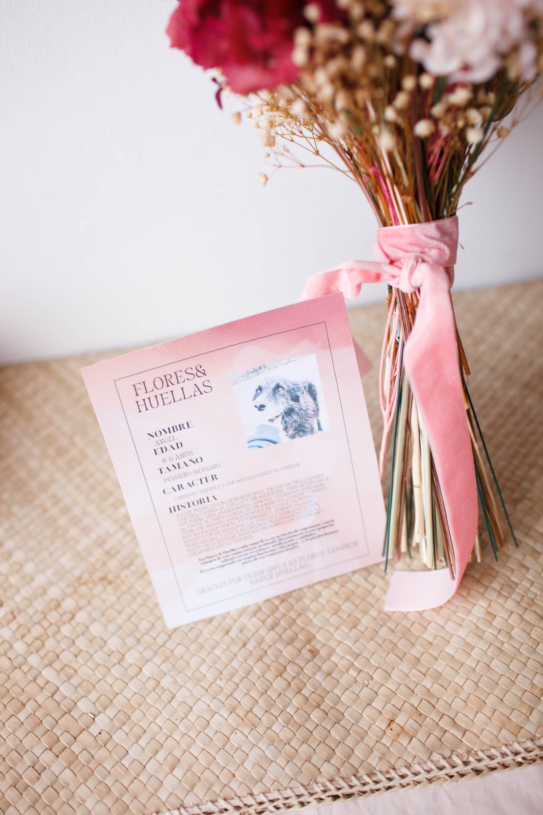 Este ramo solidario forma parte de la colección Flores & Huellas y está dedicado a Ángel, un perrito que necesita cuidados, atención y un poco más de ayuda para seguir adelante.