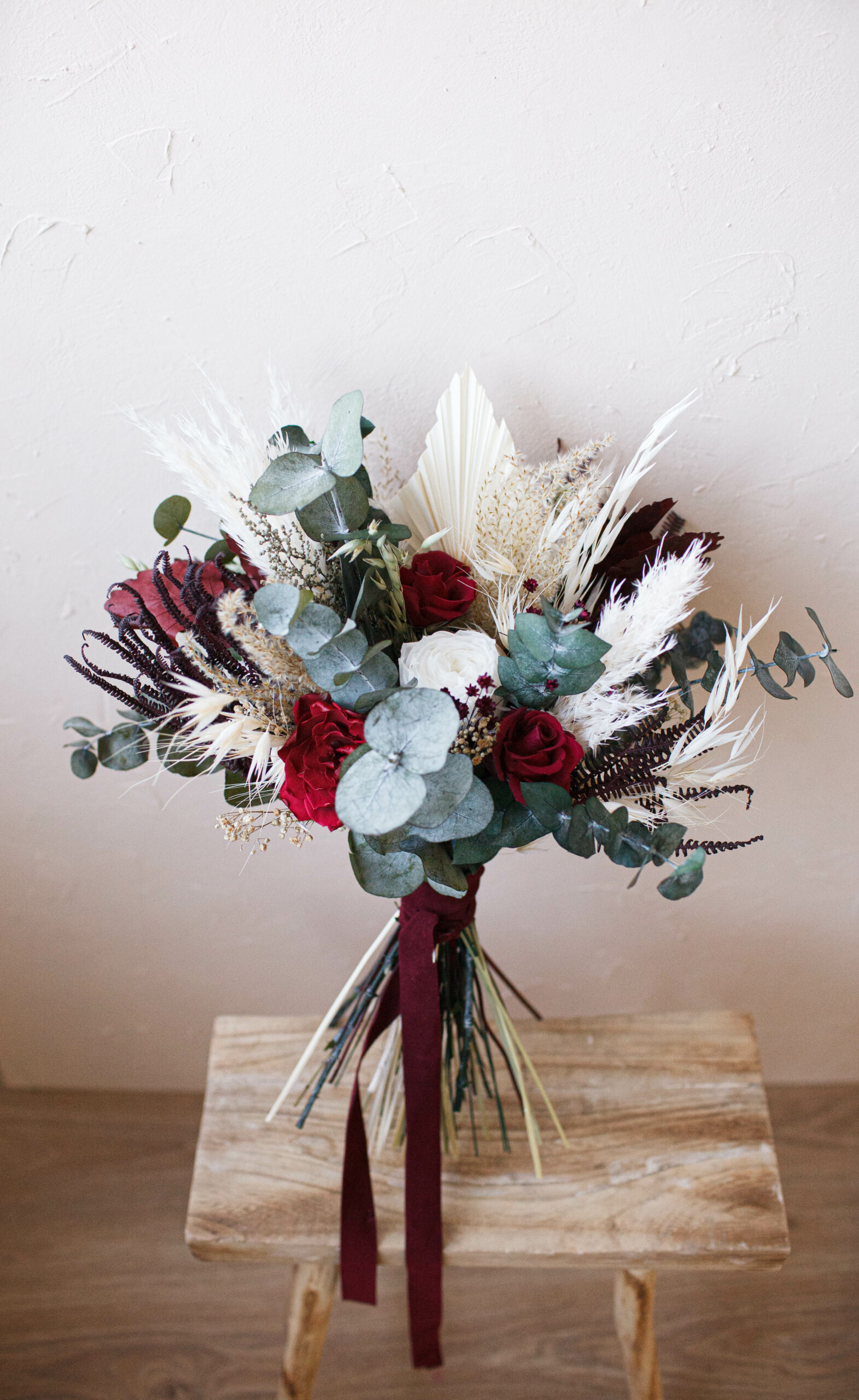 Ramo preservado de estilo bohemio con rosas rojas, palma y hortensia – Colección Flores de Diseño