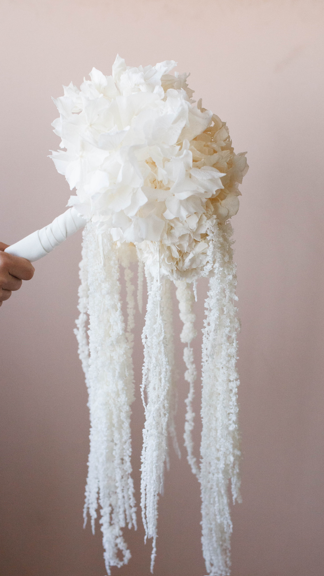Está compuesto por hortensias blancas preservadas y amaranthus preservado, que aportan volumen en la parte superior y movimiento fluido en la caída, creando un efecto visual ligero y envolvente. Se completa con un delicado lazo de terciopelo blanco, que añade un acabado refinado y atemporal.
