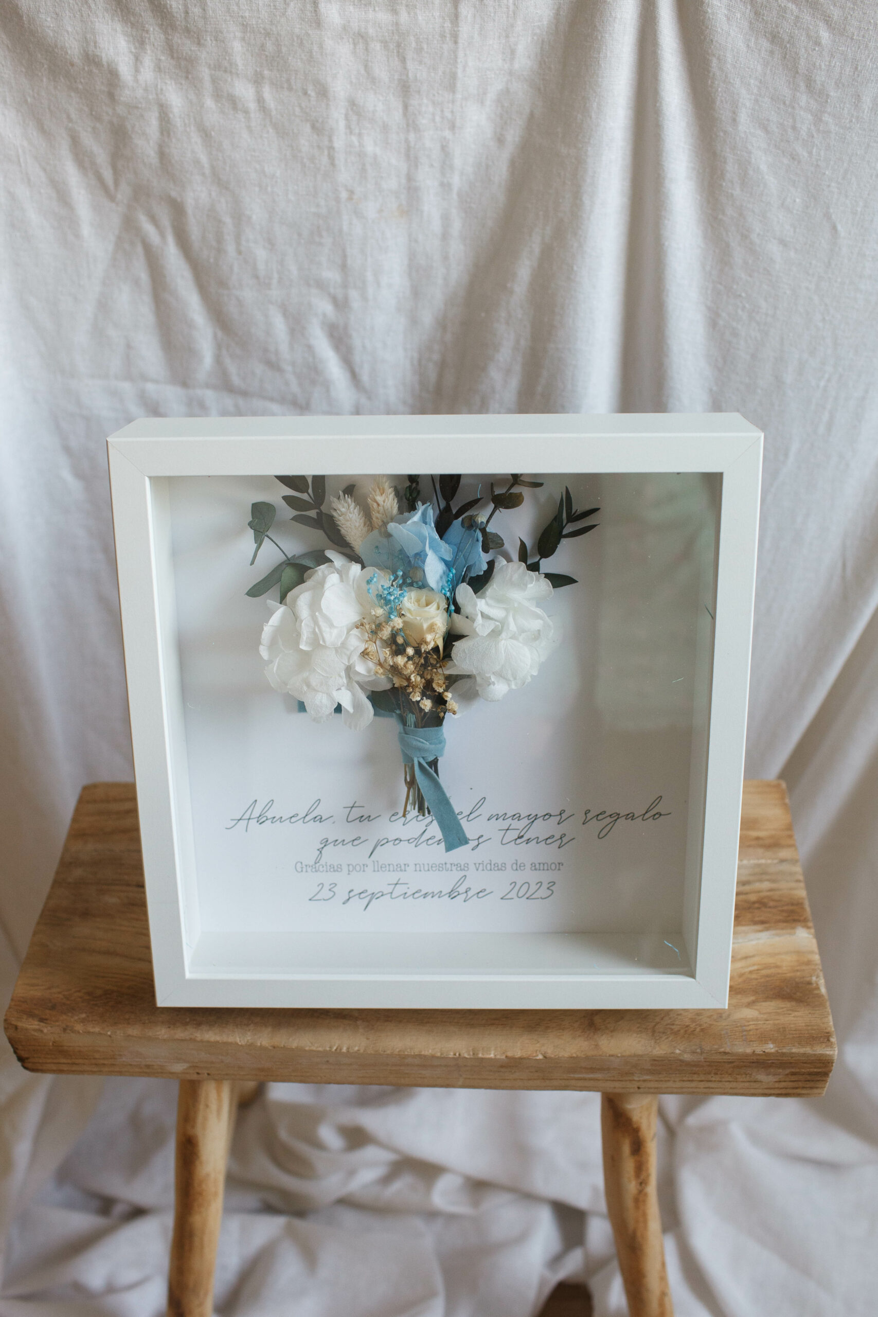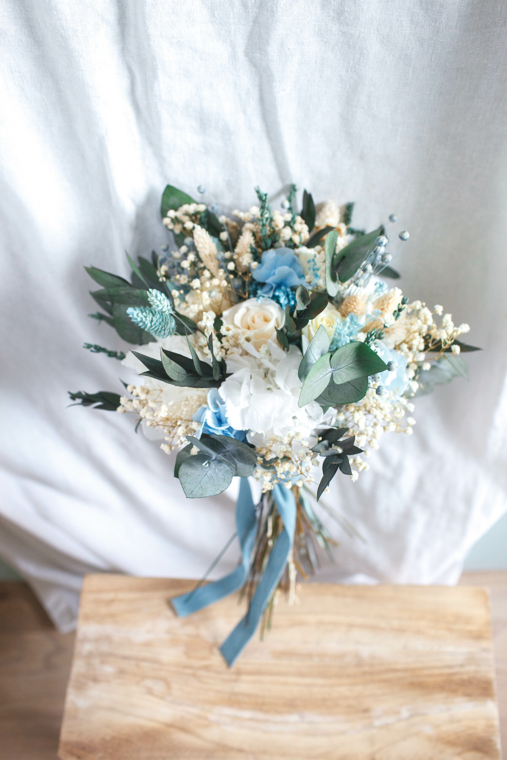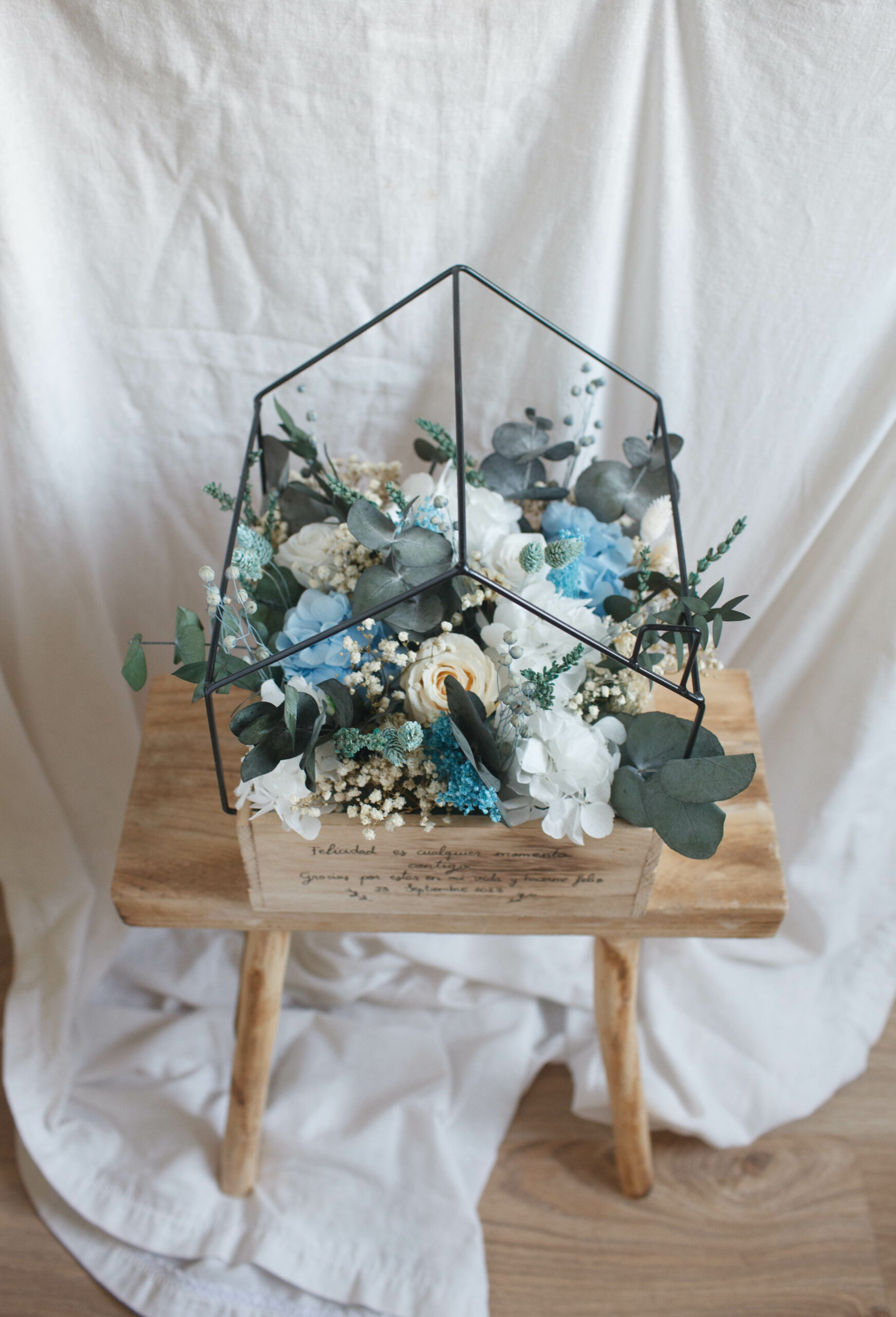 Ramo preservado en tonos azul cielo, blanco roto y verde profundo – Colección Flores de Diseño