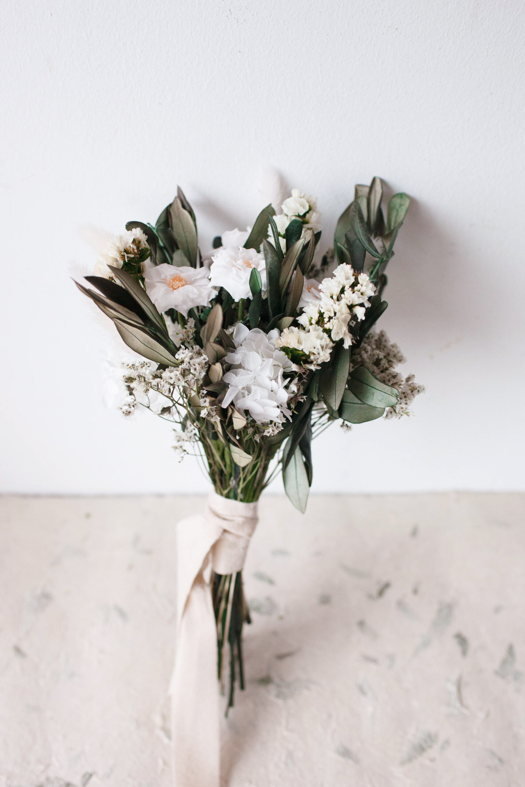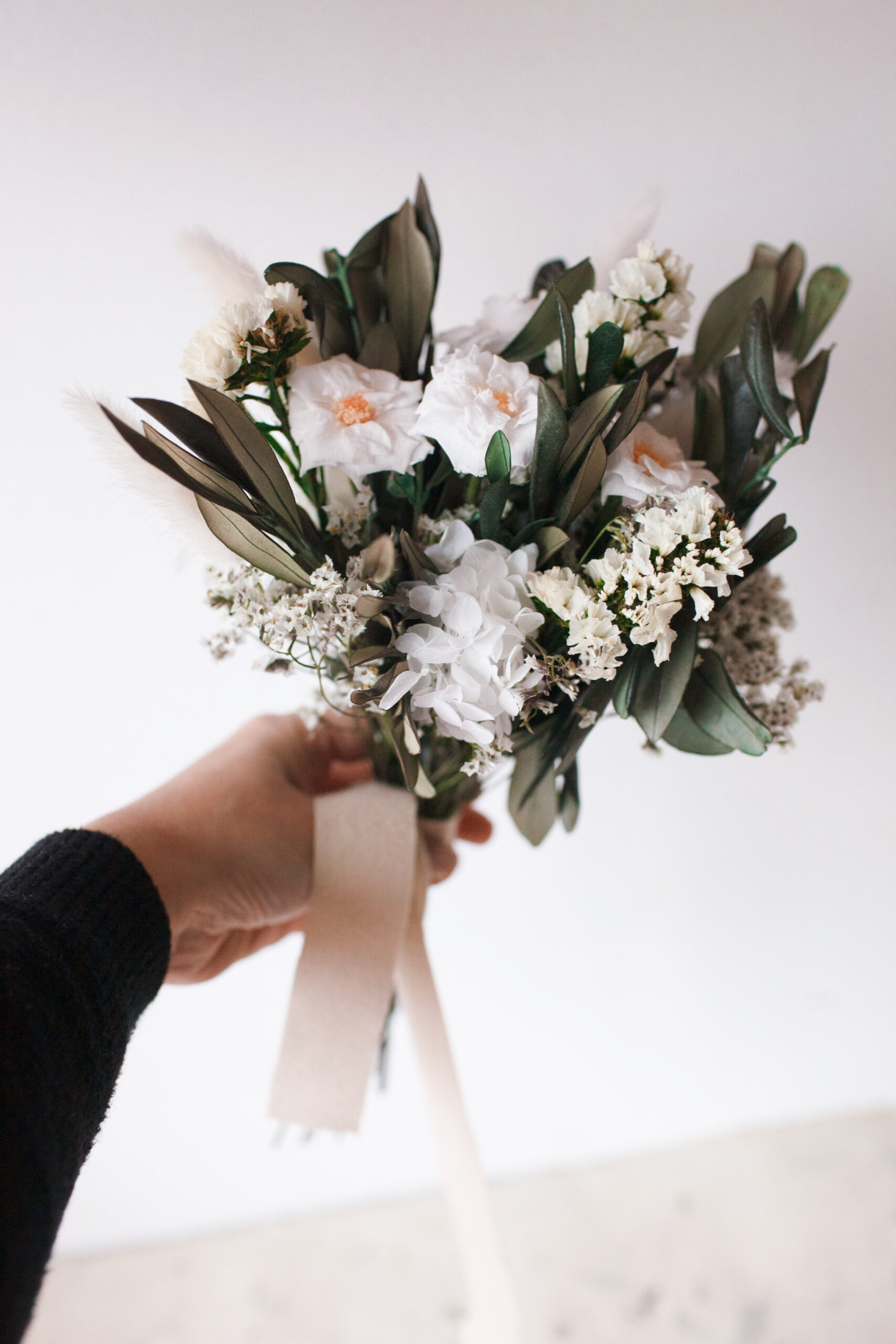 Flores: Rosas salvajes preservadas, olivo, lagurus y eucalipto