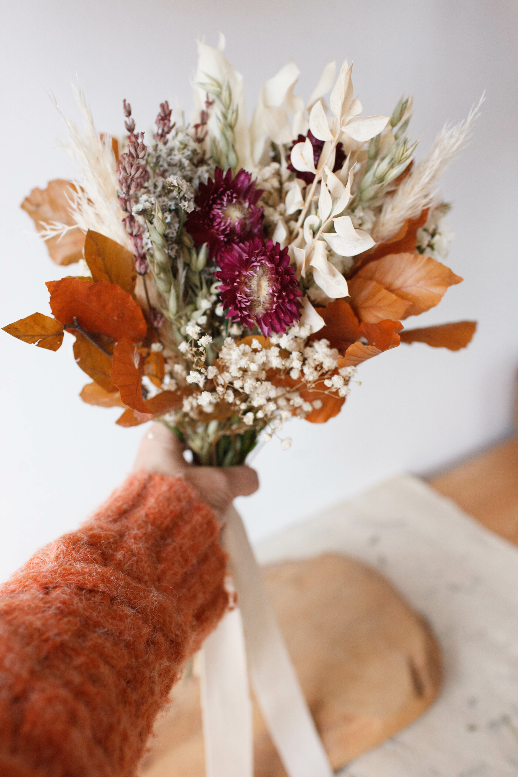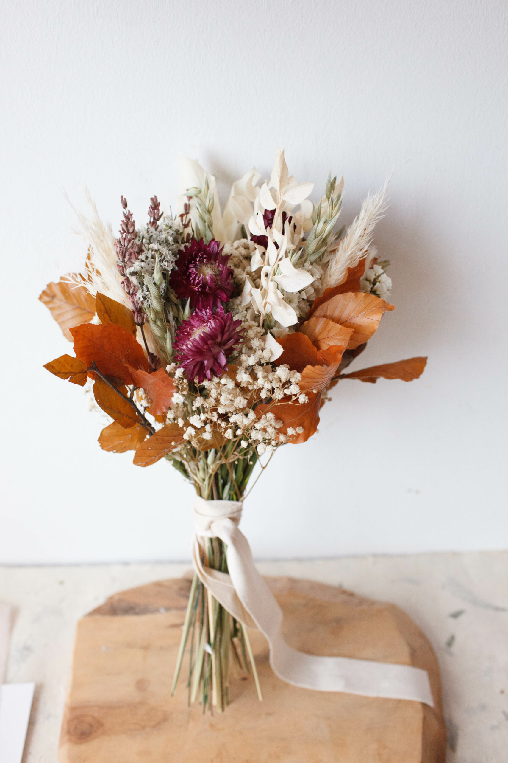 Flores: Helycrisum en tono frambuesa, lavanda, hojas de haya ocre, avena, ruscus y flor silvestre preservada