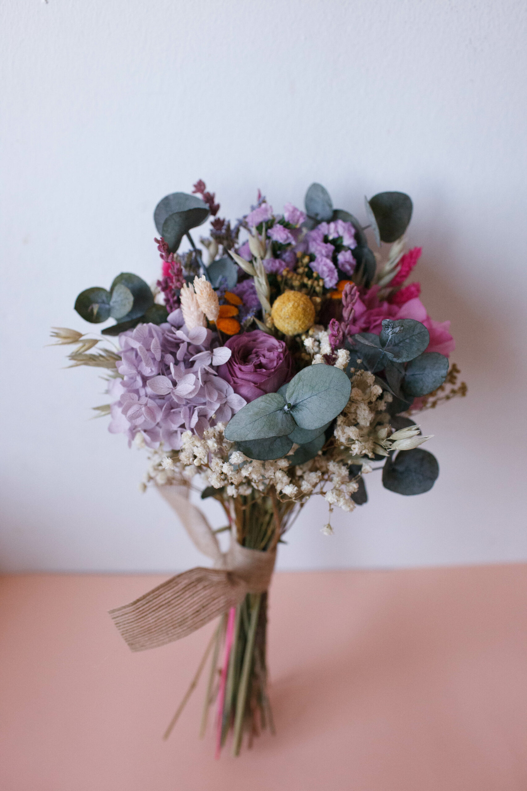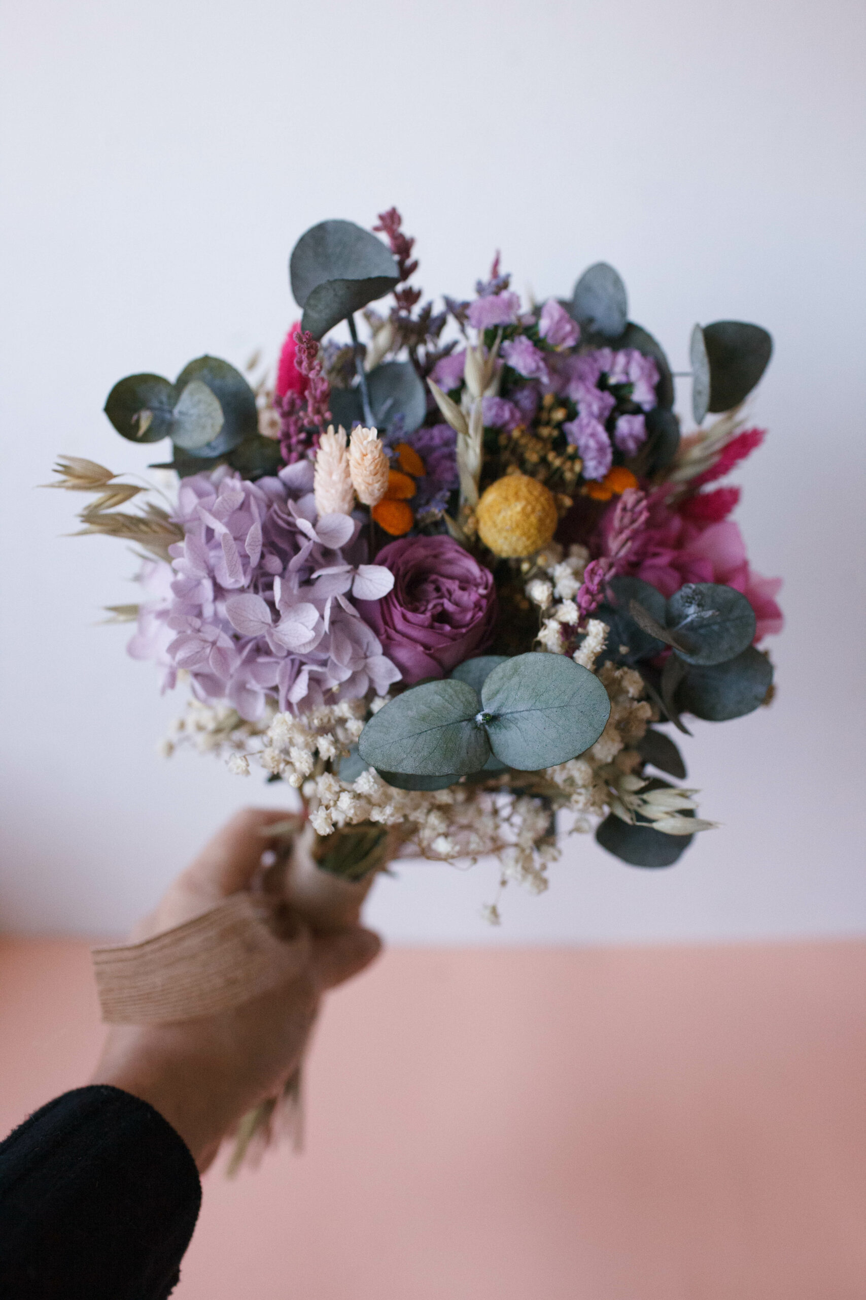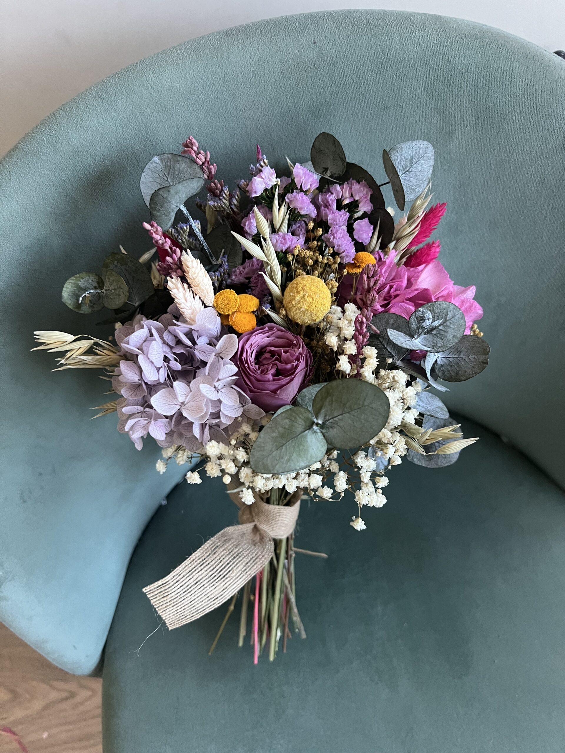 Este ramo combina rosas inglesas preservadas en tono buganvilla con hortensia en tonos lila, creando una base suave y elegante. Se completa con siempreviva, paniculata, avena y eucalipto, junto con pequeños detalles en tonos amarillos y ocres que añaden profundidad y personalidad al diseño.