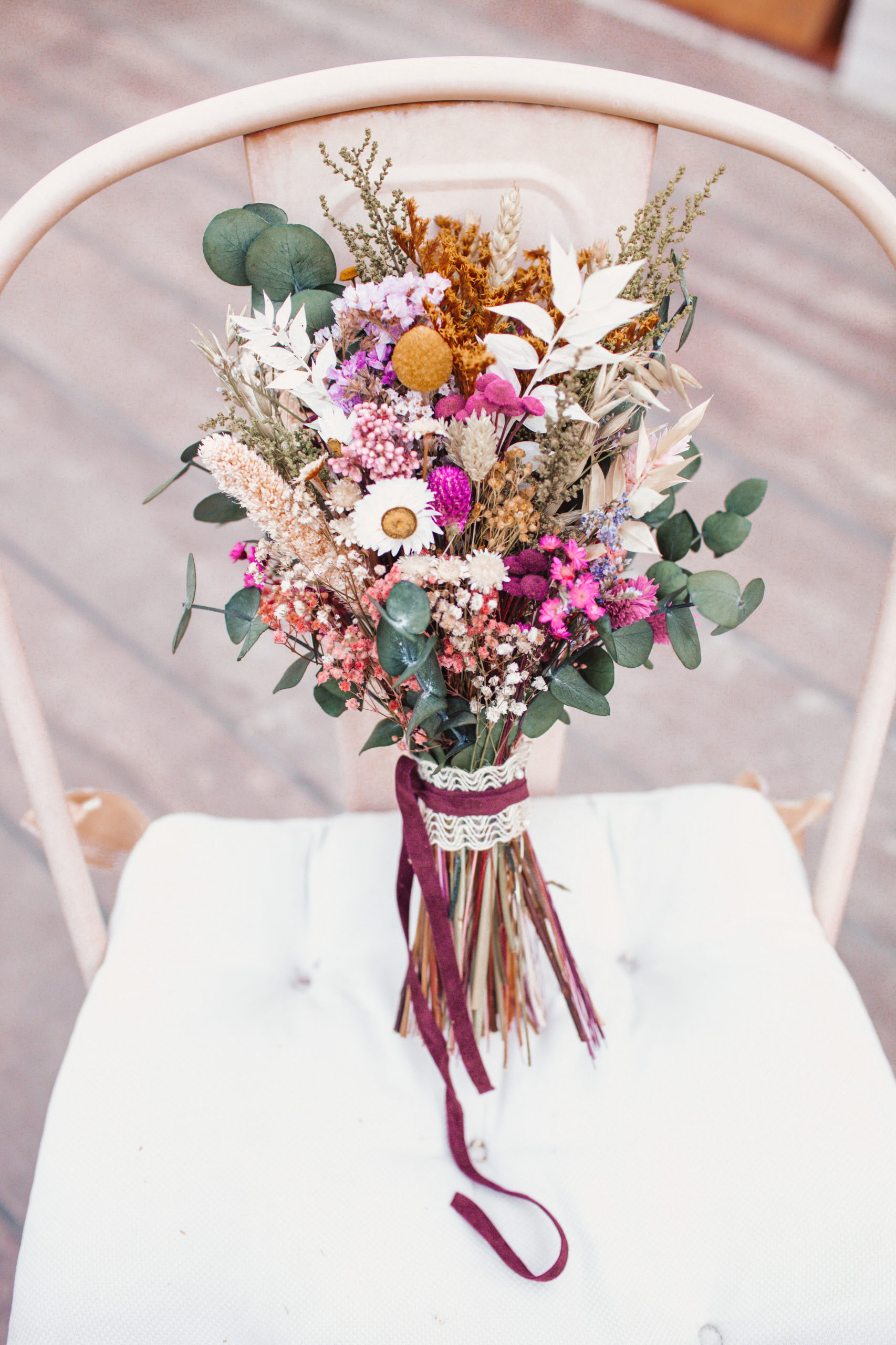 Este ramo está elaborado con una cuidada selección de rodanthe, glixia, solidago, setaria, eucalipto, avena y ruscus preservados, que aportan textura, volumen y movimiento. La mezcla de flores silvestres y verdes crea una composición ligera y orgánica, muy característica del estilo natural y artesanal de nuestra floristería.