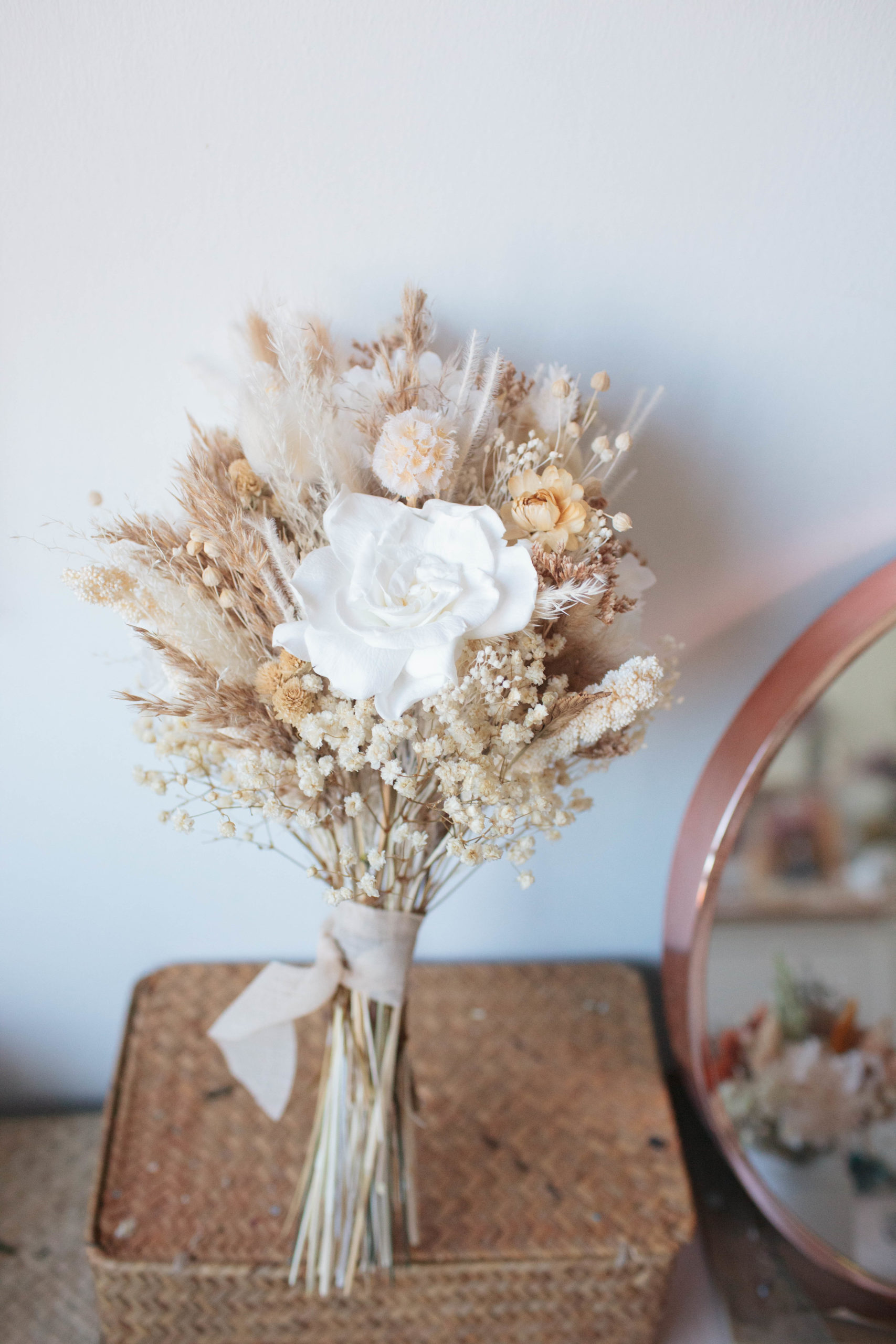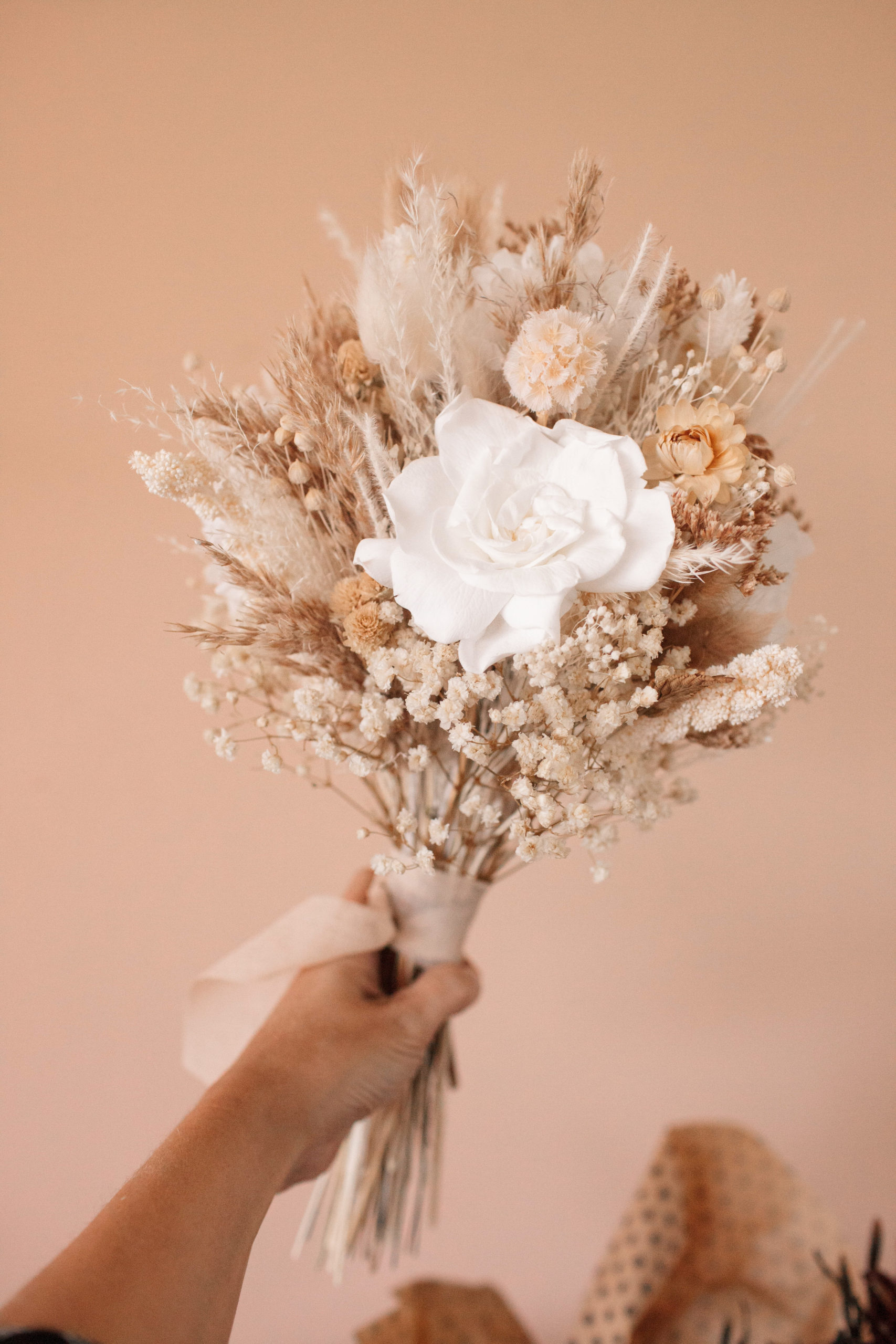 Por su paleta neutra y romántica, es el ramo de novia perfecto para bodas de estilo nórdico, rústico sofisticado o celebraciones en la playa. También es una elección exquisita como objeto de decoración para hogares que buscan calidez y luz.